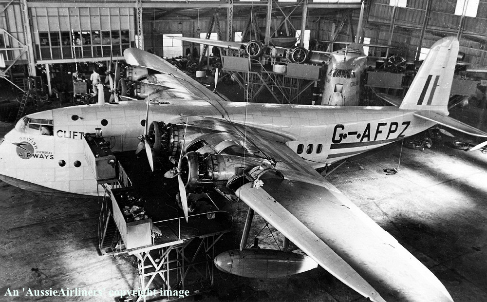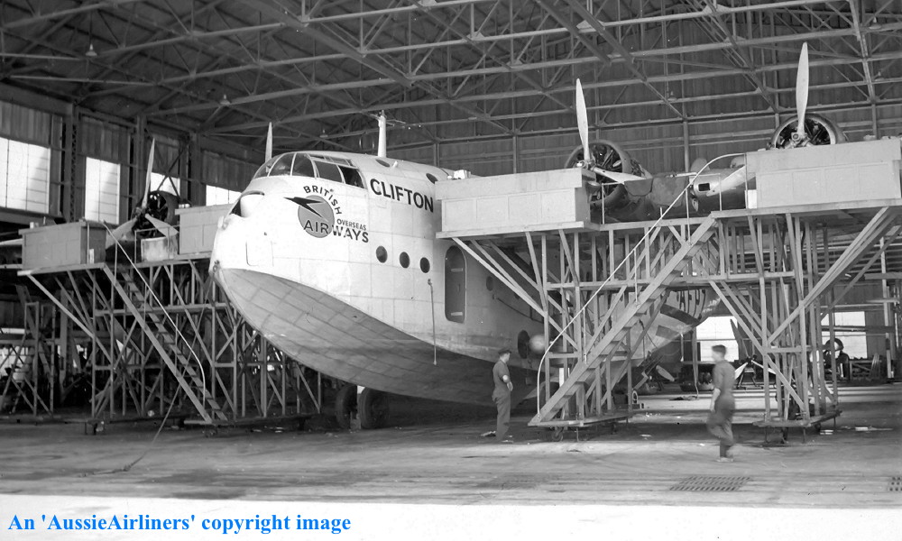 G-AFPZ. British Overseas Airways - 'Clifton' in the civilian 'war time' livery at Rose Bay, Sydney, date unknown. (R. N. Smith Collection Copyright Image 2545-256.) |