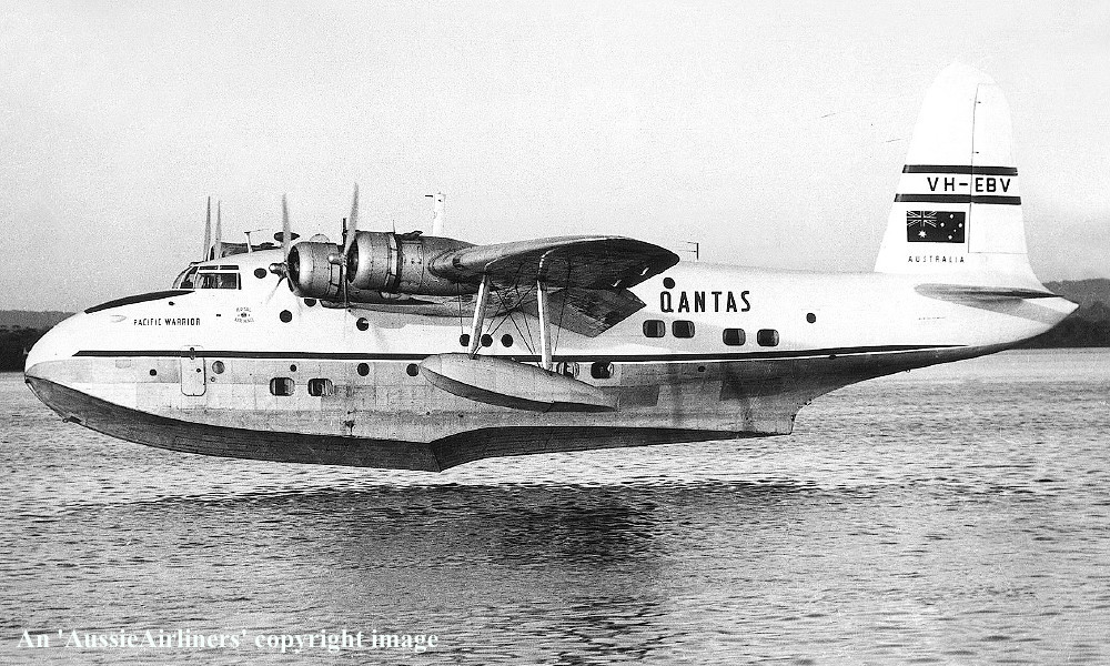 VH-EBV. Qantas - 'Pacific Warrior' in the standard livery at Sydney Rose Bay, date unknown. (A. J. Jackson Collection Copyright Image 2545-820.) |