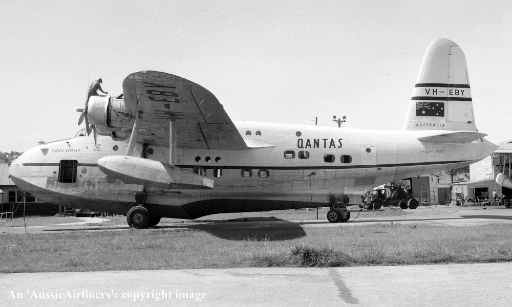 VH-EBY. Qantas - 'Pacific Voyager' in the final livery at Sydney Rose Bay, date unknown. (Qantas Heritage Collection Copyright Image 2545-833.) |