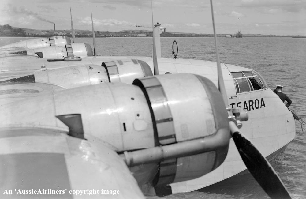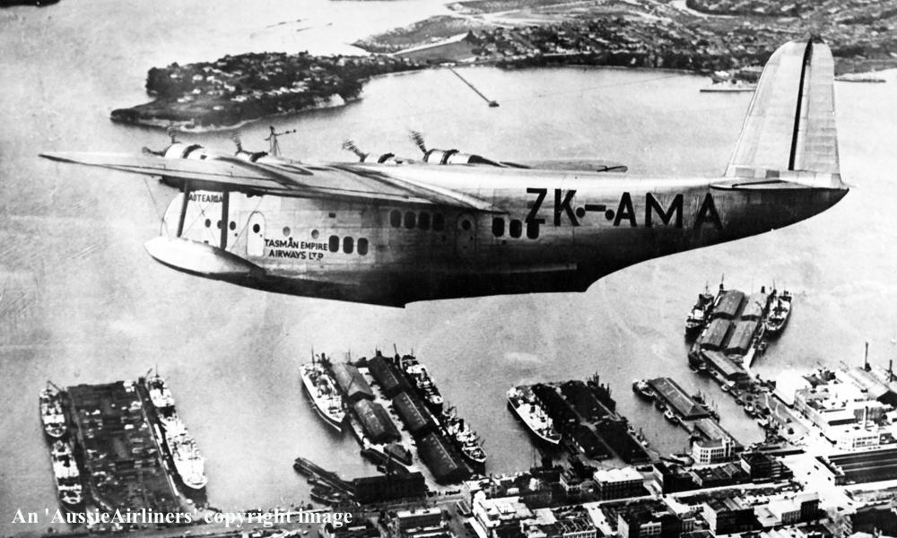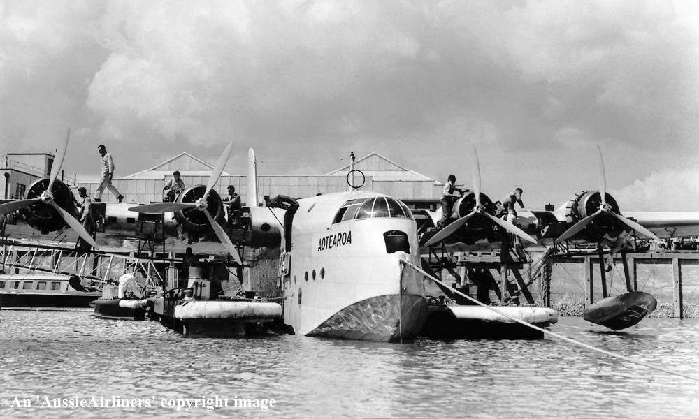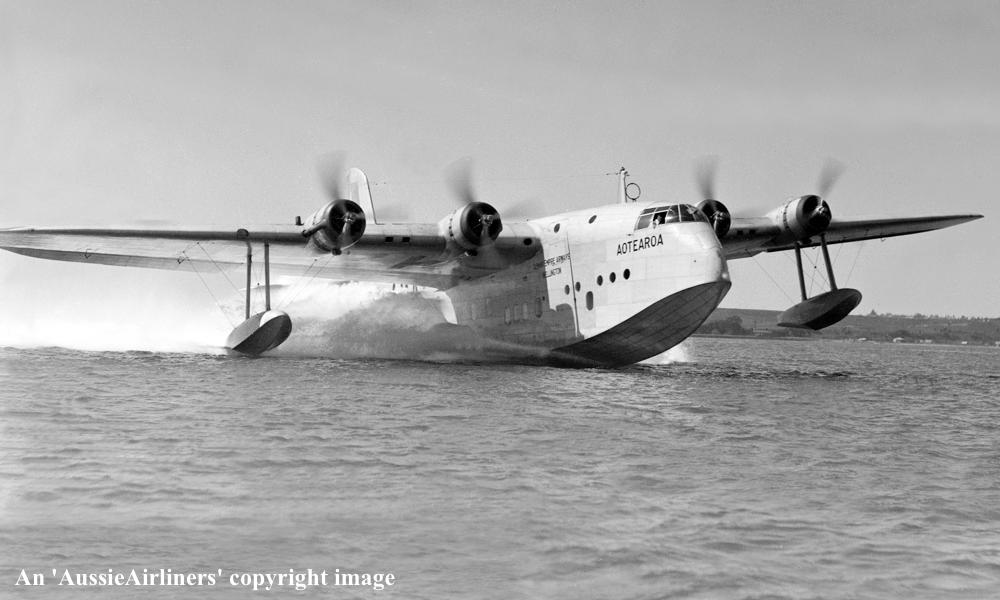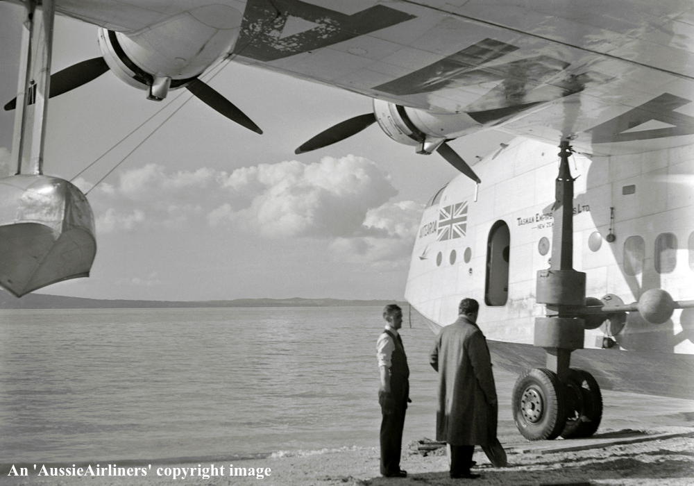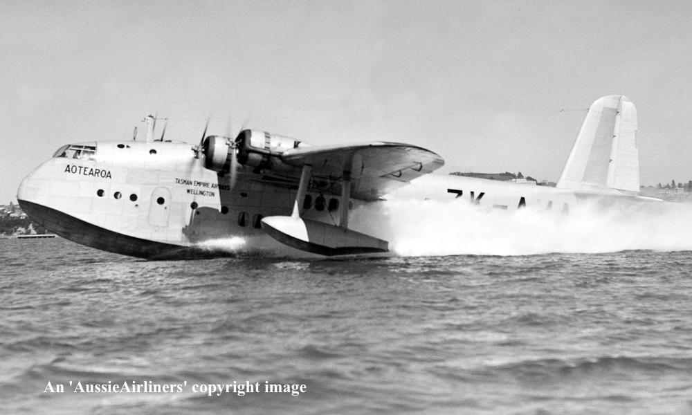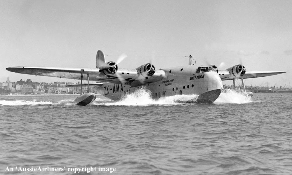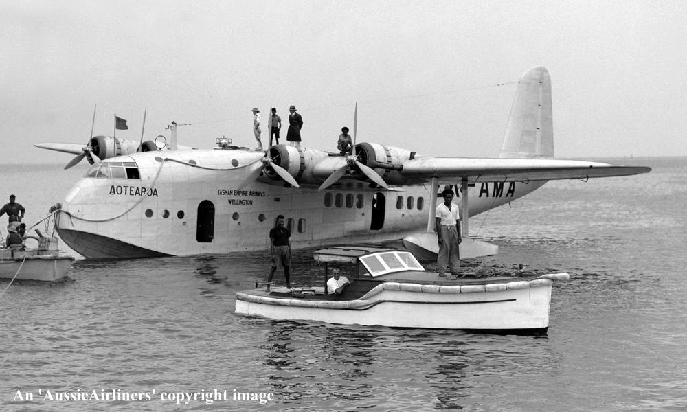 ZK-AMA. Tasman Empire Airways Ltd - 'Aotearoa' in the standard livery at Waitemata Harbour, Auckland, September 1939. (Whites Aviation Collection Copyright Image 2545-763.) |