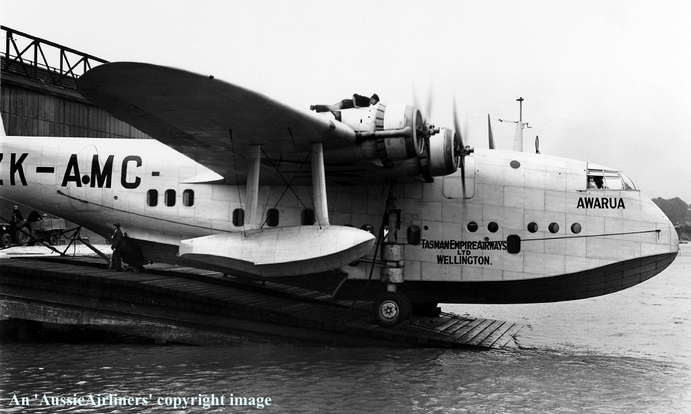 This aircraft was the thirty-nineth Empire boat completed and flown by Short Brothers at Rochester, Kent Ordered by Imperial Airways - October 21, 1937 It was one of three Short S.30s earmarked for operations between Sydney and Auckland, New Zealand by TEAL Entered onto the British Aircraft Register as G-AFDA (CofR 8211) - November 15, 1937 Registered to Imperial Airways Ltd, Victoria Station, London Completed as an S-30 Empire Class boat with 890 h.p. Bristol Perseus XIIc engines The fuel capacity was increased to 1,770 gallons It had an all-up weight of 48,000 lb (21,780 kg) but was later increased to 53,000 lb (24,200 kg) It cruised at 164 m.p.h. with a still-air range of 1,914 miles / 3,551 km This aircraft was originally intended to be TEAL's third aircraft ZK-AMC 'Awarua' When launched onto the Medway it was marked as 'ZK-AMC' and named 'Awarua' Officially cancelled from the British Aircraft Register - April 22, 1939 First flown as 'ZK-AMC' - May 09, 1939 Certificate of Airworthiness (CofA) Issued - May 12, 1939 Delivered to Imperial Airways, London - May 12, 1939 The original aircraft name of 'Cumberland' was never applied To read a condensed history of this aircraft please click 'HERE' As the organisational structure of TEAL had not been agreed upon at this time the aircraft was stored by Imperial Airways at Hythe until prepared for delivery to TEAL To read about the change of identity of this aircraft (c/n S.886) please click 'HERE' It departed Southampton on the delivery flight to New Zealand - August 16, 1939 It arrived at Auckland on completion of the delivery flight - August 28, 1939 Flight crew: Captains J. W. Burgess, W. Craig Delivery route: Southampton - Marseilles - Athens - Alexandria - Tiberias - Basra - Jiwani - Karachi - Gwalior - Calcutta - Rangoon - Singapore - Surabaya - Koepang - Darwin - Groote Eylandt - Townsville - Brisbane - Sydney - Auckland To read about the final leg of this delivery flight please click 'HERE' and 'HERE' Operated Auckland - Suva survey flight (Captain J. W. Burgess) - September 07 - 10, 1939 Operated Auckland - Sydney - Auckland survey flight (Captain J. W. Burgess) - September 24 - 30, 1939 Operated Auckland - Suva - Nuku'alofa (Tonga) - Auckland survey flight - October 21 - 23, 1939 Flew the inaugural Auckland - Sydney service (Captain J. W. Burgess) as AW1 - April 30, 1940 It carried 9 passengers and 7 crew on this flight covering the 1,341 miles in 7 hours 30 minutes Operated the return service Sydney (Rose Bay) - Auckland as AE1 - May 02, 1940 Officially entered onto New Zealand Aircraft Register as ZK-AMA - May 02, 1940 Registered to Tasman Empire Airways Ltd, Wellington Aircraft was named 'Aotearoa' (long white cloud) This aircraft was fitted with Hamilton Standard full feathering propellers - mid 1942 It was one of only two aircraft to be fitted with such propellers Flew the final Sydney - Auckland S-30 Empire service - November 07, 1947 This flight marked its 446th Auckland - Sydney - Auckland commercial crossing Withdrawn from use and stored at Hobsonville, Auckland 'ZK-AMA' and 'ZK-AMC' combined made 1,736 trans-Tasman crossings with 98.72 % completed The aircraft was ferried to Hobsonville for long-term storage - November 12, 1947 TEAL's chief engineer George Bolt had the honour of carrying out this flight Sold to Messrs Carter and Mabee by public tender as an obsolete aircraft - June 25, 1948 Certificate of Airworthiness (CofA) cancelled - July 05, 1948 Cancelled from the New Zealand Aircraft Register - July 05, 1948 Preparations were made to move aircraft to its final resting place at Mission Bay - August 1948 Aircraft was fast taxied from Hobsonville to Mission Bay - August 06, 1948 Rumoured to have gotten airborne for a short distance whilst off North Head, Waitemata Harbour As the tide had retreated and no beaching had arrived on site the aircraft was towed to Mechanics Bay for the night It was towed back to Mission Bay - August 07, 1948 Beached on the site of the old Walsh Brothers Flying School at Mission Bay mid-morning Towed across Tamaki Drive to its final destination - August 08, 1948 It was opened for public inspection with visitors being able to sit in the pilot's seat Widely reported that it had been refitted to operate as a tearoom but this did not eventuate Scrapped on site by Dermott & Linn, scrap merchants - October 1950 |