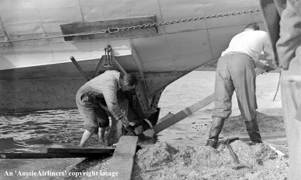 ZK-AMA. Tasman Empire Airways Ltd - 'Aotearoa' in the final livery at Mission Bay, August 06, 1948. The aircraft is being beached for the last time. (Whites Aviation Collection Copyright Image 2545-739.) |