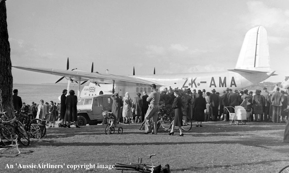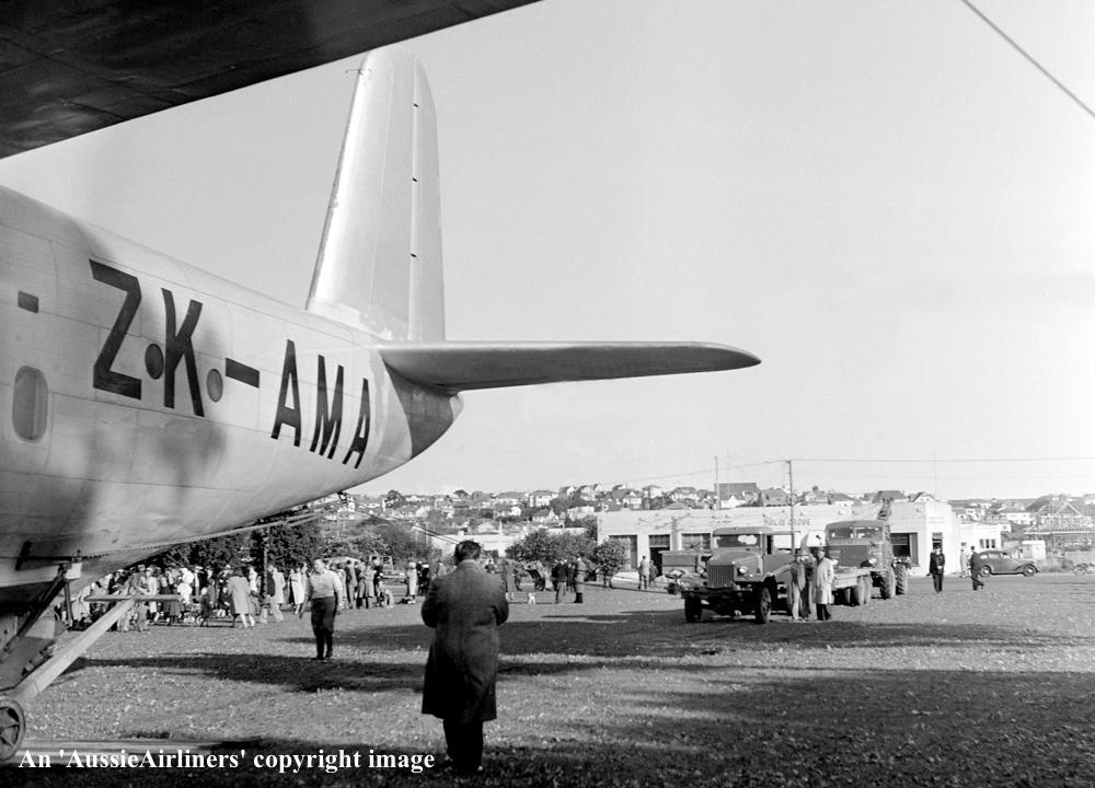 ZK-AMA. Tasman Empire Airways Ltd - 'Aotearoa' in the final livery at Mission Bay, August 06, 1948. (Whites Aviation Collection Copyright Image 2545-741.) |