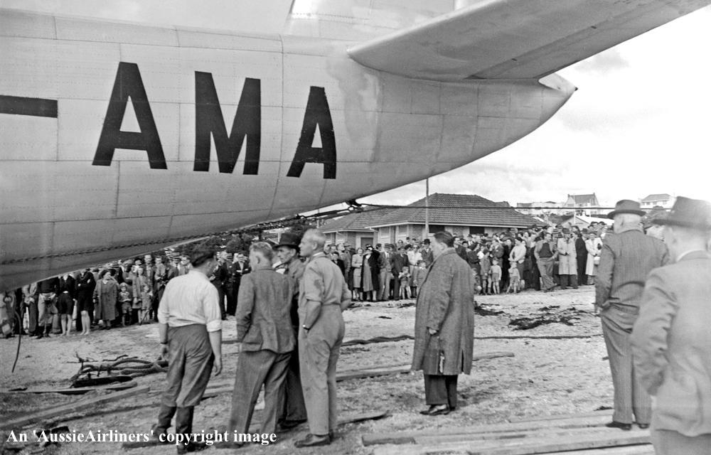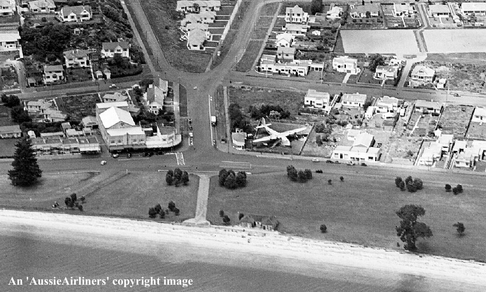 ZK-AMA. Tasman Empire Airways Ltd - 'Aotearoa' in its final resting place at Tamaki Drive, Mission Bay, December 03, 1948. (Whites Aviation Collection Copyright Image 2545-774.) |