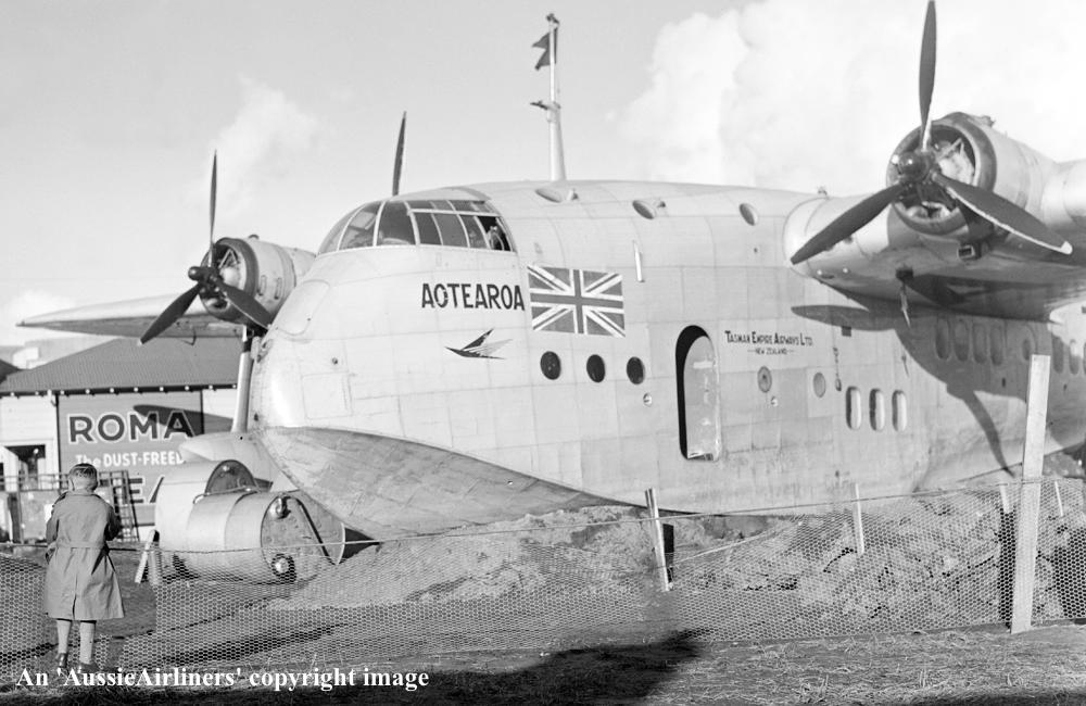 ZK-AMA. Tasman Empire Airways Ltd - 'Aotearoa' in the final livery at Mission Bay, August 06, 1948. (Whites Aviation Collection Copyright Image 2545-746.) |