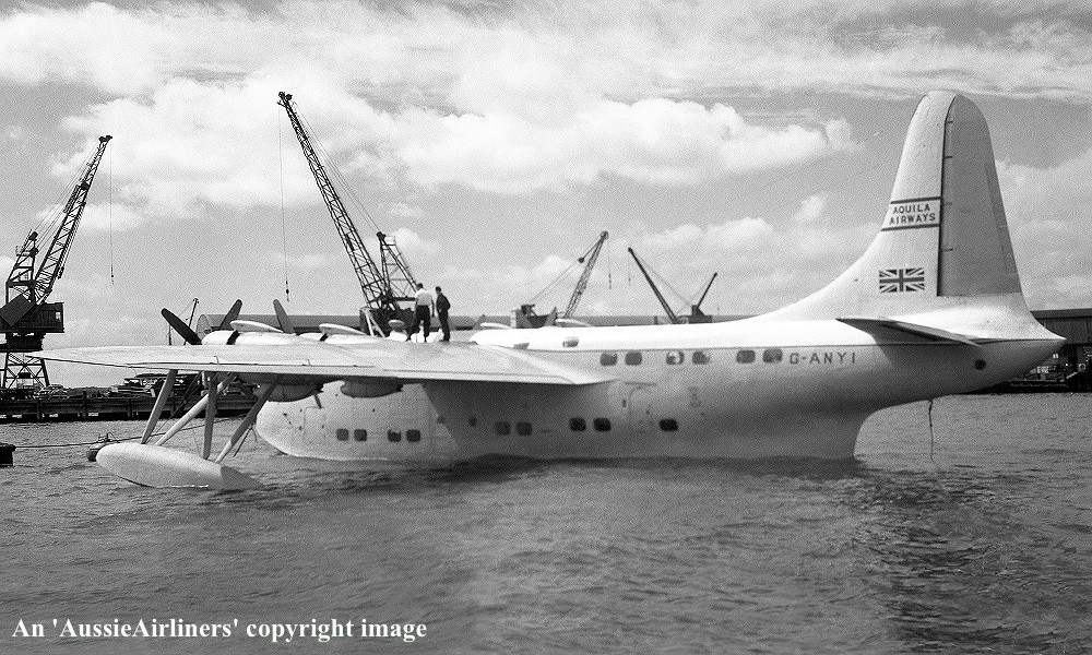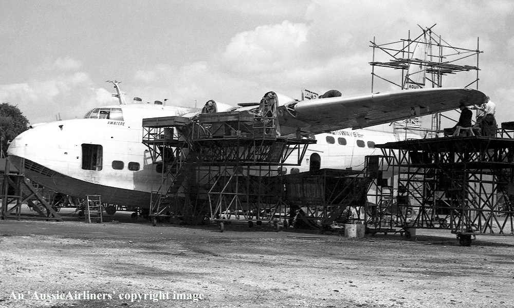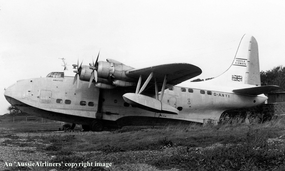 This aircraft was ordered new by Tasman Empire Airways Limited - ? Built by Short Brothers and Harland, Belfast, Northern Ireland Powered by 2,040 h.p. Bristol Hercules 733 engines It had an all-up take-off weight of 81,000 lb (36,740 kg) and a still-air range of 3,000 miles / 4,830 km It was configured to seat 44 passengers Entered onto the New Zealand Aircraft Register as ZK-AMN (CofR?) - November 03, 1948 Aircraft was named 'Awatere' (swift flowing river) First flown as ZK-AMN - ? Certificate of Airworthiness (CofA) Issued - ? Departed Belfast on the delivery flight to New Zealand - October 11, 1949 Arrived Auckland on completion of the delivery flight - October 18, 1949 Delivery route: Belfast - Southampton - August - Alexandria - Bahrain - Karachi - Rangoon - Singapore - Surabaya - Darwin - Bowen - Sydney - Auckland Operated Tasman and South Pacific service - 1949 - 1954 Operated the inaugural Auckland - Suva - Labasa Solent service - June 1950 Withdrawn from use and stored at Auckland - June 1954 Sold to Aquila Airways Ltd, London - 1954 Cancelled from the New Zealand Aircraft Register - January 17, 1955 Entered onto the British Aircraft Register as G-ANYI (CofR R.4837/1) - January 17, 1955 Registered to Aquila Airways Ltd, London Departed Auckland on the ferry flight to the United Kingdom - January 17, 1955 Arrived London on completion of the ferry flight - ? The aircraft retained the TEAL name 'Awatere' Utilised by Aquila Airways on routes to the Canary Islands, Madeira and Montreaux Transfered to Aerovias Aquila, Portugal - October 27, 1958 Ferried Southampton - Lisbon - November 22, 1958 Sold to ARTOP, Portugal - October 27, 1961 ARTOP suspended services shortly thereafter due to financial problems This aircraft did not enter service and was abandoned on a beach on the River Tagus, Lisbon It was left to rot and was finally broken up for scrap - 1971 |