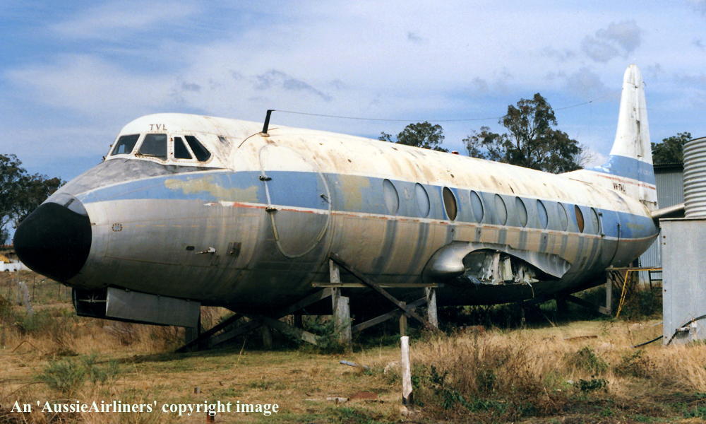 This aircraft was ordered new by Trans-Australia Airlines - ? It was built at the Vickers-Armstrong Hurn factory First flown - February 22, 1957 Entered onto the Australian Aircraft Register as VH-TVL - March 01, 1957 Registered to Australian National Airlines Commission, Melbourne It arrived at Melbourne (Essendon) on completion of the delivery flight - March 01, 1957 Known crew: Captain R. Andrews; F/O McCallum; Navigator C. O. White; Radio Operator Hobbs The aircraft was named 'James Cook' It operated its first revenue service - March 21, 1957 Set a speed record between Adelaide - Perth of 4 hours 25 minutes (Captain L. W. Manning) - July 23, 1957 Set a speed record between Longreach - Brisbane of 112 minutes (Captain D. Lawrence) - September 01, 1957 The aircraft was renamed 'George Evans' - October 1964 The name was changed to allow 'James Cook' to be used on the Boeing 727-76 'VH-TJA' Withdrawn from T.A.A. service and placed in storage at Melbourne (Essendon) - December 30, 1968 Returned to service with T.A.A. - February 27, 1969 It operated its final revenue service - August 19, 1969 Placed in storage at Brisbane (Eagle Farm) Airport Cancelled from the Australian Aircraft Register - May 24, 1971 Sold to Les Arthur of the Toowoomba Aviation Museum - November 1971 It was dismantled and trucked by low-loader to Toowoomba - November 13, 1971 Sold to Jensens Metals, Toowoomba - 1978 Sold to J. Aspromourgus and transported to Wildmans Timber Yard - April 1989 Aircraft had flown 30,275 hours with 21,474 cycles |