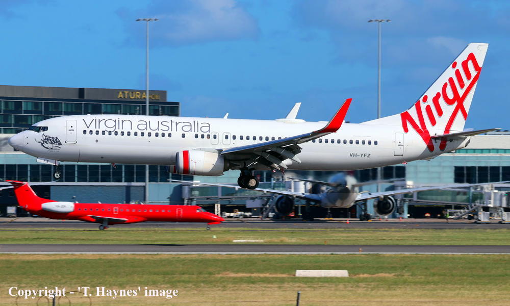 VH-YFZ. Virgin Australia - 'Lake St. Clair' in the standard livery at Sydney Kingsford Smith Airport, April 06, 2024. (F. McGuire Copyright Image 4623-361.) |