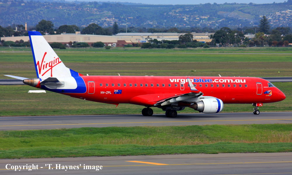 VH-ZPL. Virgin Blue - 'Samba Blue' in the standard livery at Adelaide West Beach Airport, May 18, 2014. (T. Haynes Copyright Image 0190-606.) |