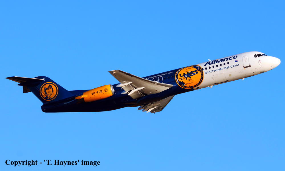 VH-FGB. Alliance - in the special livery with '90th Anniversary First Ever Trans Pacific Flight' titles at Adelaide West Beach Airport, November 27, 2025. (T. Haynes Copyright Image 1996-395.) |