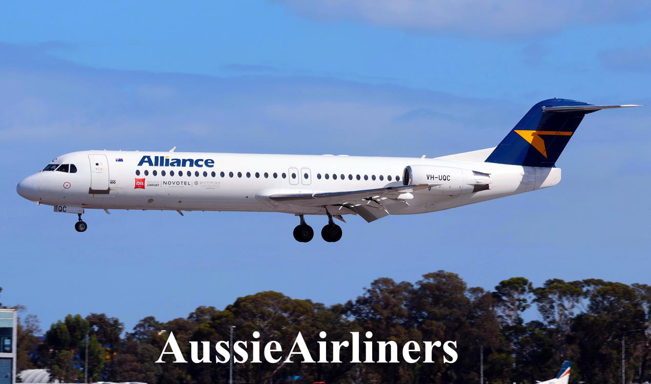 VH-UQC. Fokker F28-0100. Alliance - in the standard livery with additional decals at Adelaide West Beach Airport, December 07, 2025.