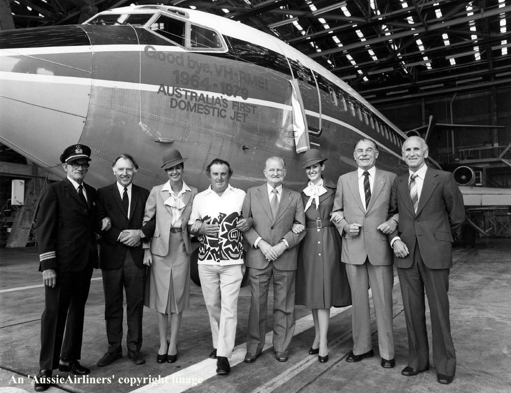 VH-RME. Ansett Airlines of Australia - in the 'delta' livery with additional 'Goodbye VH-RME 1964-1979' titles at Melbourne Tullamarine Airport, September 1978. From L to R: Navigator Bill Kennedy; Captain John McRobbie; Hostess Kim Olver; Snr Flight Engineer Mark Perry; Flight Engineer Allan Williams; Hostess Fran Kelly; Captain Alex McNaughton; Captain Arthur Lovell. (E. D. Daw Collection Copyright Image 4610-133.) |