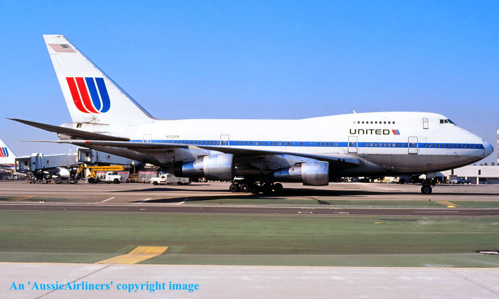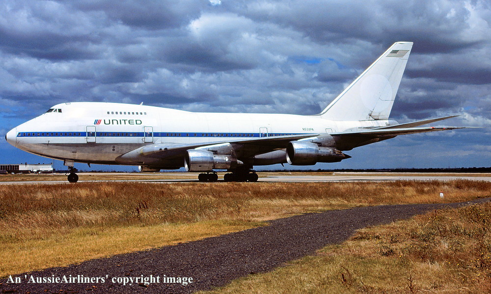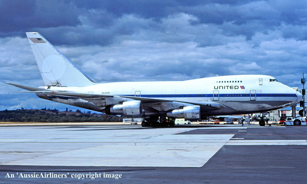 N532PA. United - in the basic 'Pan Am' livery at Melbourne Tullamarine Airport, February 1986. (R. N. Smith Copyright Image 4635-495.) |