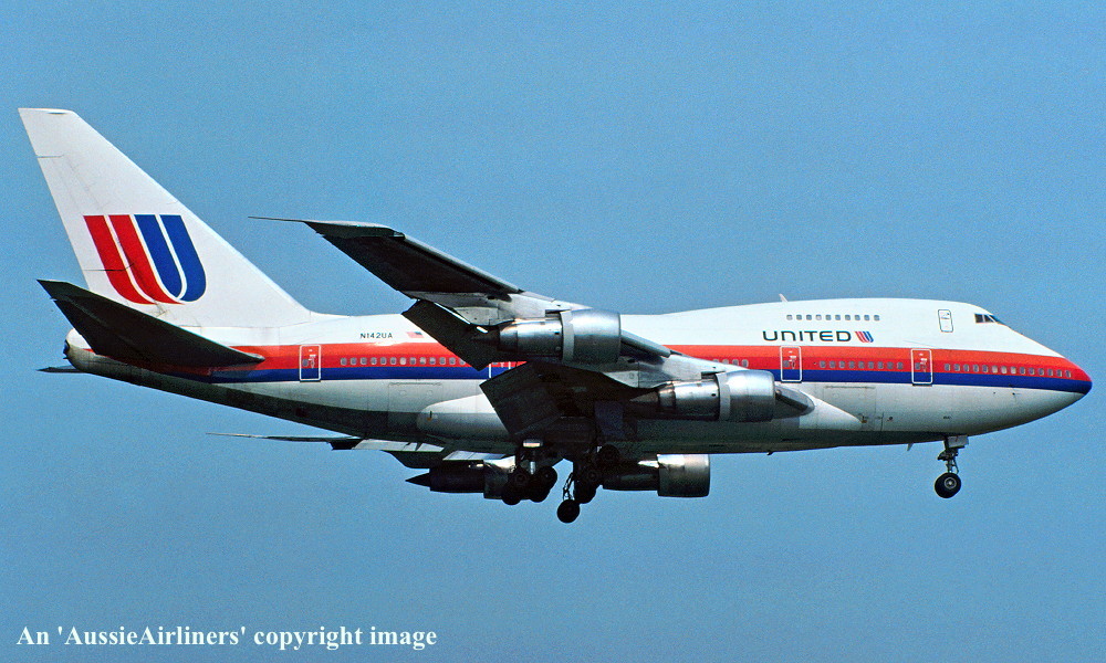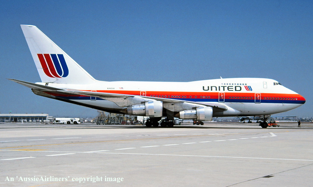 N142UA. United - in the original livery at an unknown airport, August 1988. (R. N. Smith Collection Copyright Image 4635-132.) |