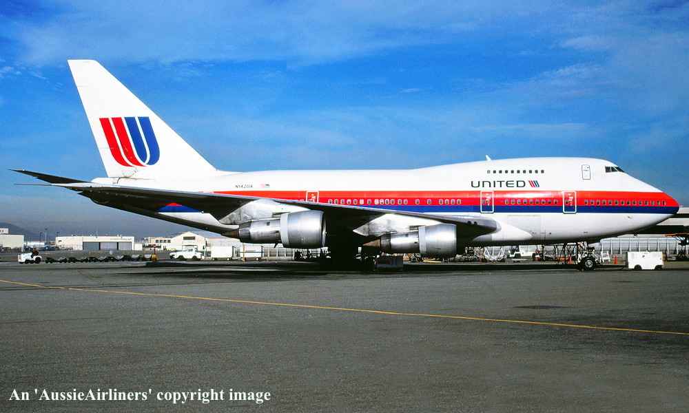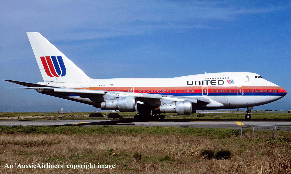 N142UA. United - in the original livery at San Francisco Airport, January 1988. (R. N. Smith Collection Copyright Image 4635-550.) |