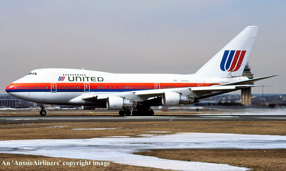 N142UA. United - in the final livery at an unknown airport, June 1991. (R. N. Smith Collection Copyright Image 4635-551.) |