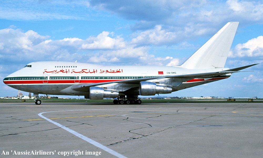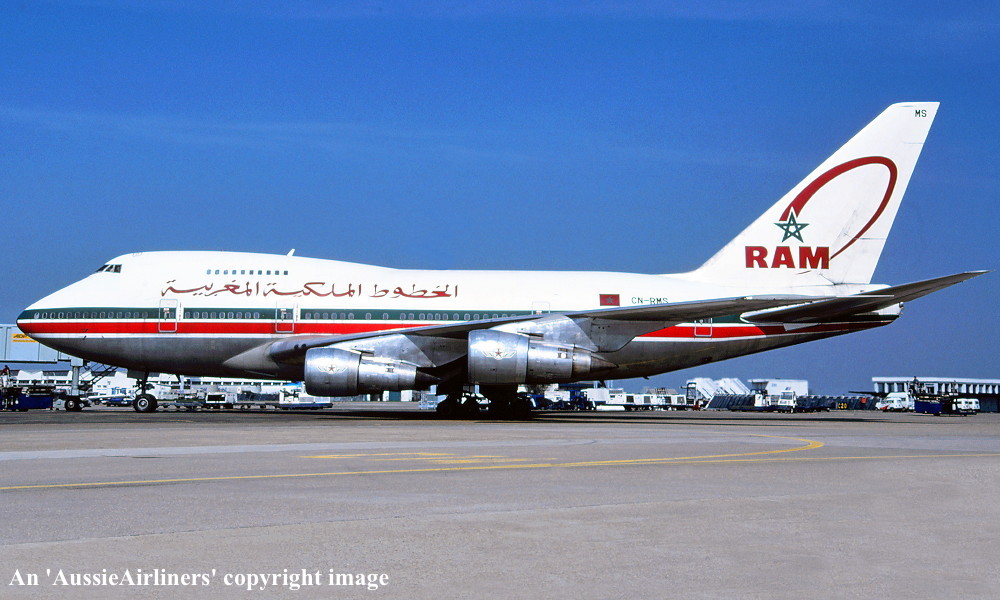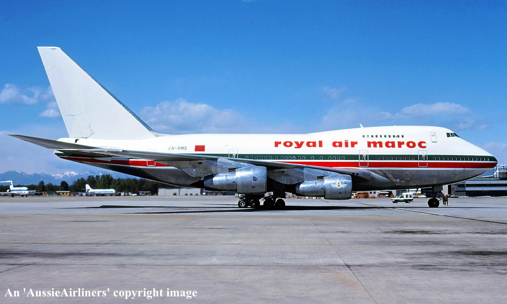 CN-RMS. Royal Air Maroc - in the standard livery at an unknown airport, April 1988. (R. N. Smith Collection Copyright Image 4635-614.) |