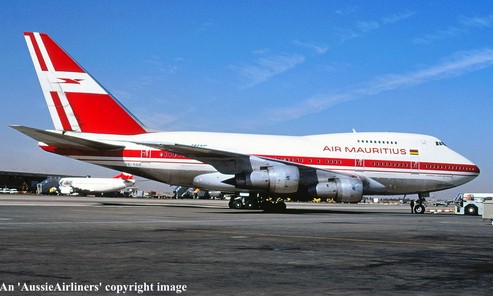 3B-NAR. Air Mauritius - 'Chateau Labourdonnais' in the standard livery at an unknown airport, July 1992. (R. N. Smith Collection Copyright Image 4635-398.) |