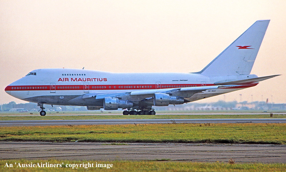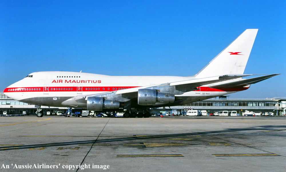 3B-NAO. Air Mauritius - in the non-standard livery at Amsterdam Schiphol Airport, October 1988. (R. N. Smith Collection Copyright Image 4635-183.) |