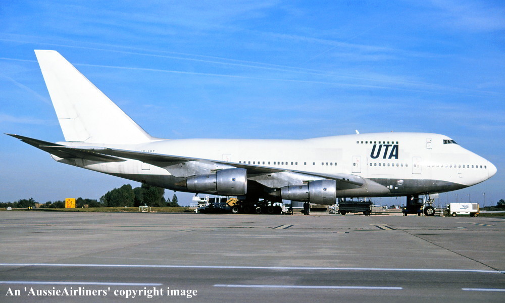 LX-LGY. UTA - in the all-white livery at Paris Orly Airport, October 1989. (R. N. Smith Collection Copyright Image 4635-571.) |
