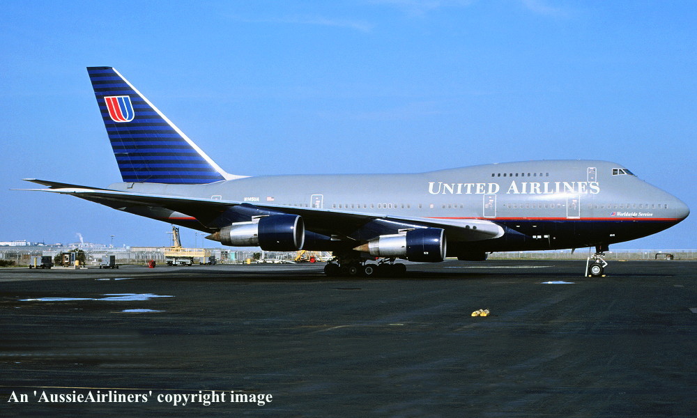N145UA. United Airlines - in the new livery at San Francisco Airport, February 1994. (R. N. Smith Collection Copyright Image 4635-160.) |