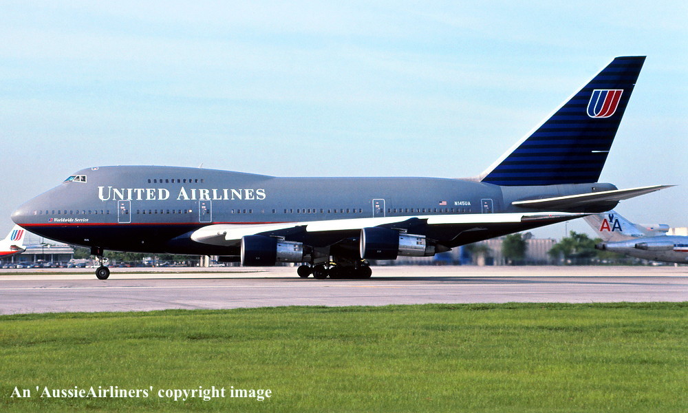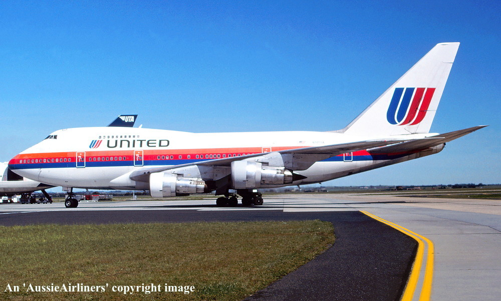 N145UA. United Airlines - in the new livery at an unknown airport, August 1993. (R. N. Smith Collection Copyright Image 4635-457.) |