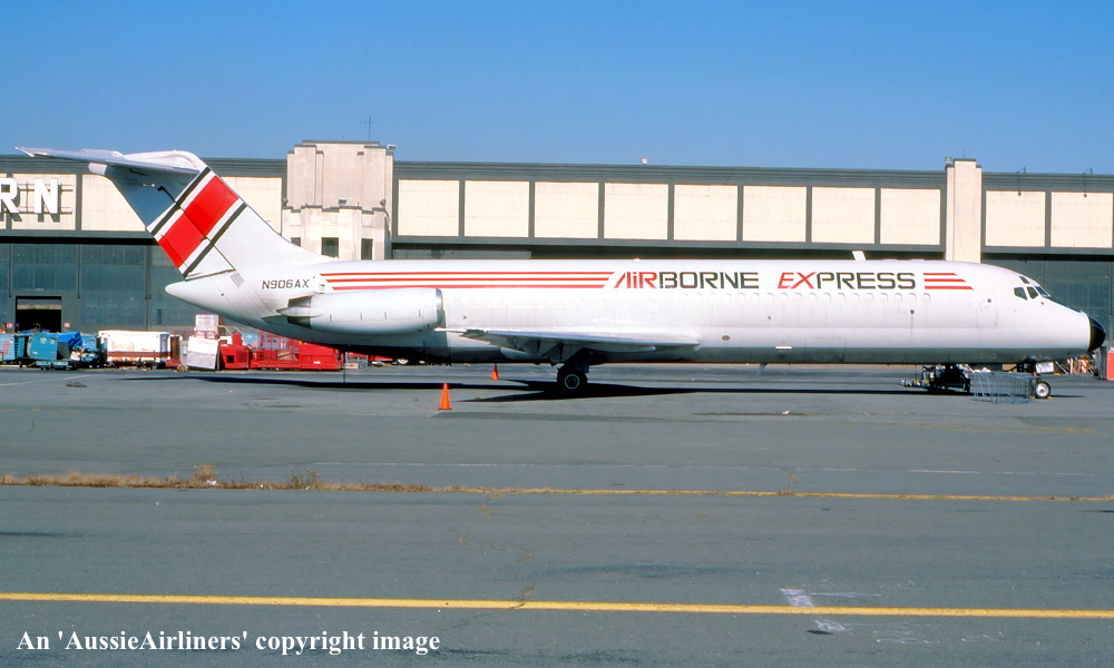 N906AX. Airborne Express - in the original livery at an unknown airport, August 24, 1983. (R. N. Smith Collection Copyright Image 1135-464.) |