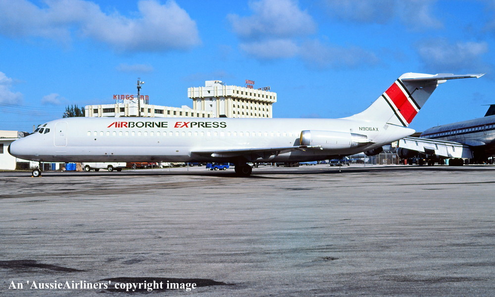 N906AX. Airborne Express - in the original livery at Miami Airport, December 1982. (R. N. Smith Collection Copyright Image 1135-354.) |